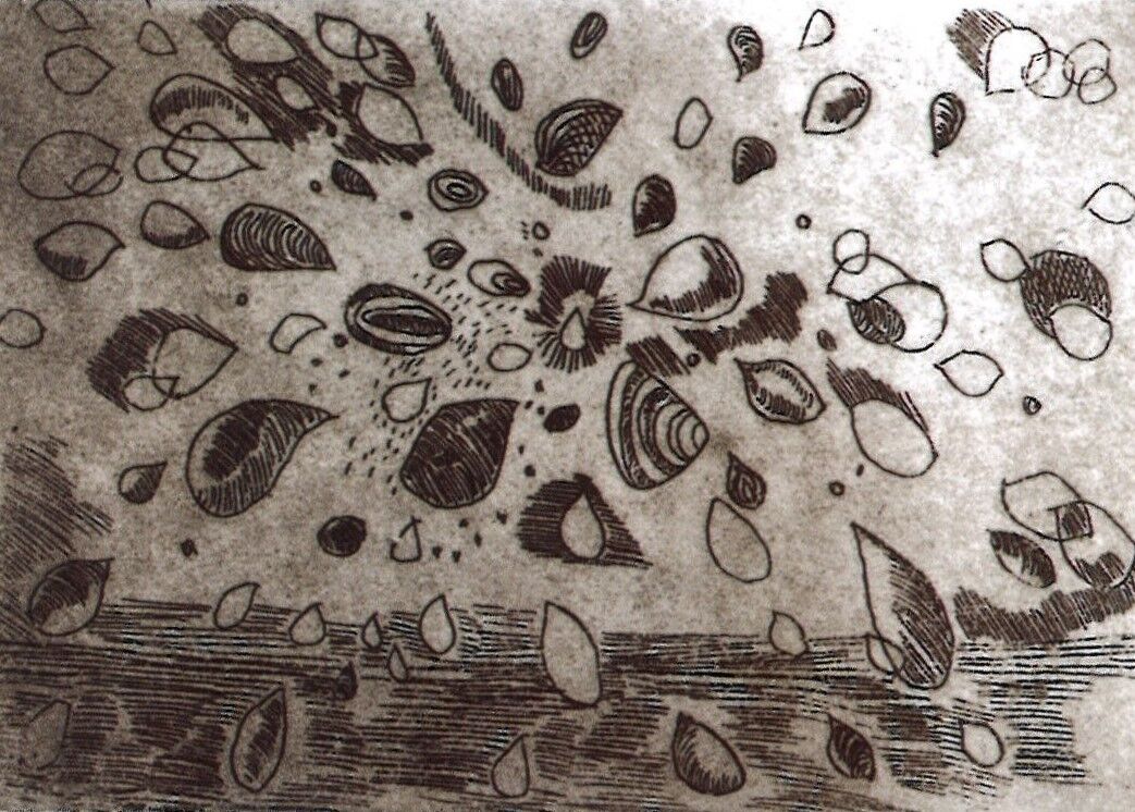 さらに、1958年に制作されたエッチングの《貝》も、そのタイトルを含めて、三岸好太郎のデッサンからの系譜に位置付けることができるだろう。しかし、この《貝》を、そのタイトルや三岸からの影響という流れにおいてのみとらえてしまうのは、片手落ちである。貝殻の形を示しながら、輪郭だけの描画は、瑛九の版画や油彩画に頻出する形状を示し、線の反復や密集は、画面の抽象度を高めている。