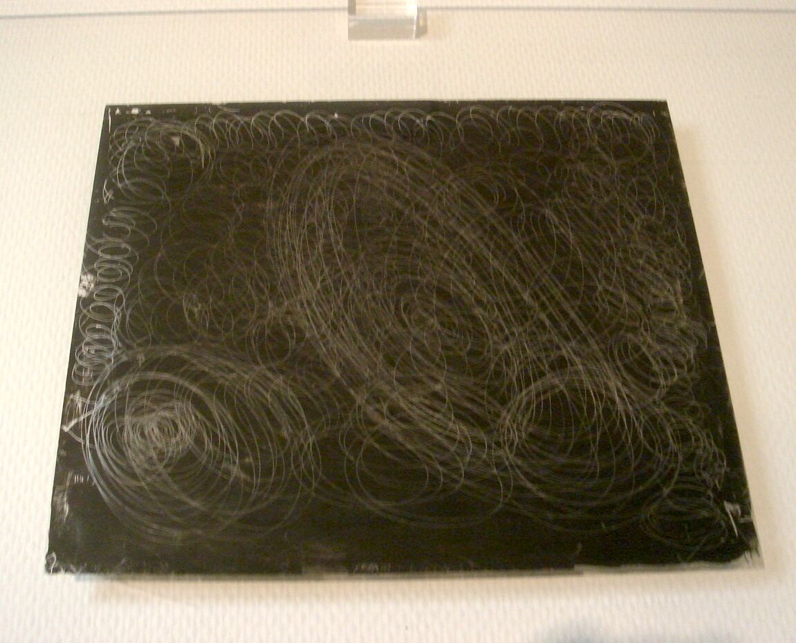 そして、fig.4 を見れば分かる通り、fig.3 の黒く細い線は、透明シートを黒く塗りつぶし、これを引っ掻いて得られた線を光が透過して、印画紙上に出現している。塗りつぶされた面を鋭利な道具によって引っ掻いて線を露出させているため、その線は、細く、鋭い。このように、ベースとなる画面の背景と線の明暗が、fig.3 とfig.1 とでは、反転している。fig.1 の白い線は、塗りつぶされた面を引っ掻いて得られた線ほどの細さや鋭さはなく、細いとはいえ、描画材料の物質的な筆触を感じさせるものである。