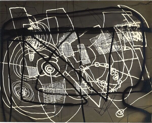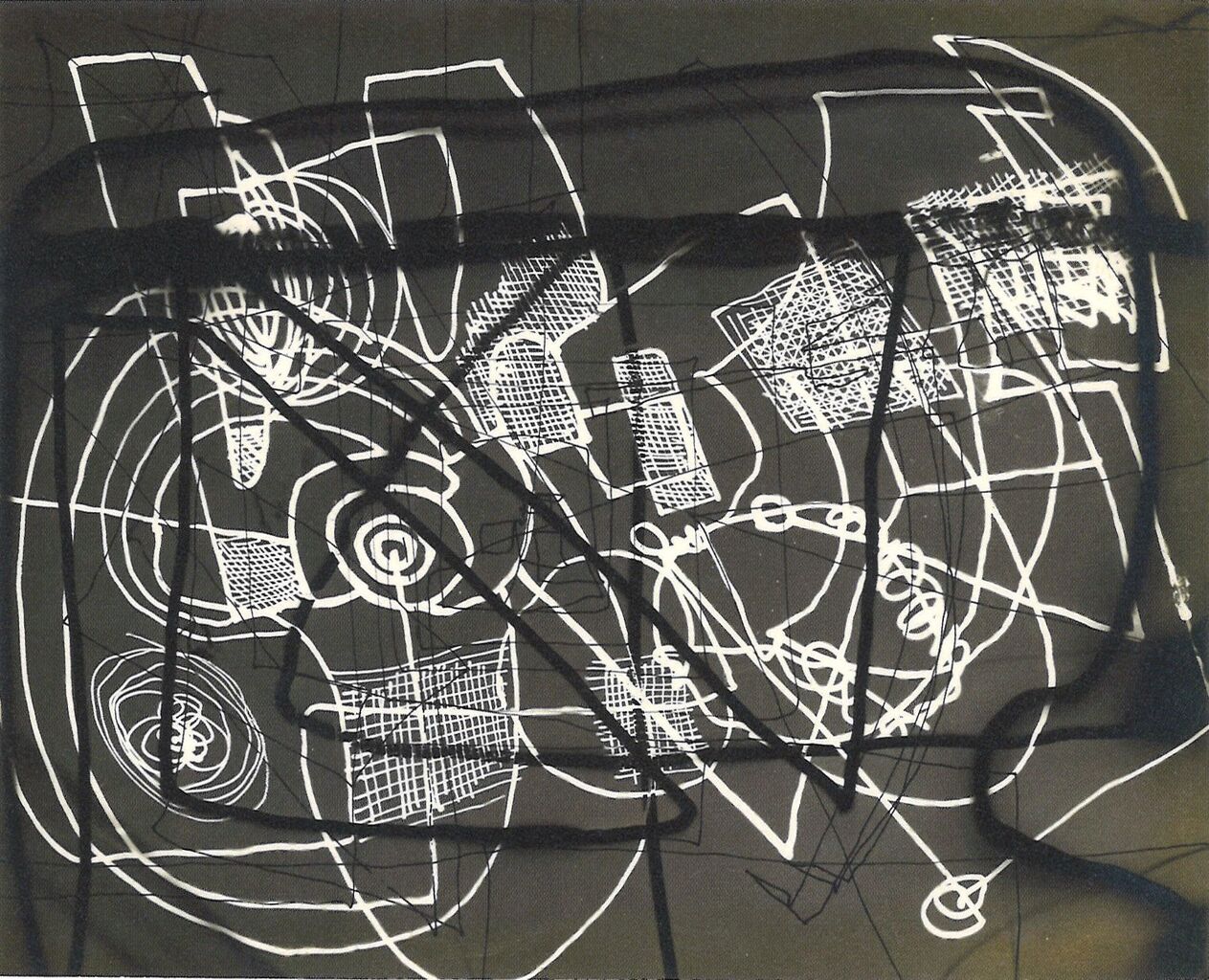 これに対して、白い線は、上記の推測の通りだとすれば、透過性のあるシートに描画した材料を用いているため、その材料を作る工程は、紙などの支持体に描画する作業と大きく変わることはなく、瑛九は、自らの描画の経過を目にしながら、その作業を続けていたと思われる。これは、絵画性の強い作業であり、このフォト・デッサンが、絵画的な傾向の強いものであることを導いている。だが、瑛九は、そのような絵画的な描画だけでは、フォト・デッサンが備えている偶然性や即興性という特質が十分に発揮されないことを、もちろん、よく理解していたはずである。
