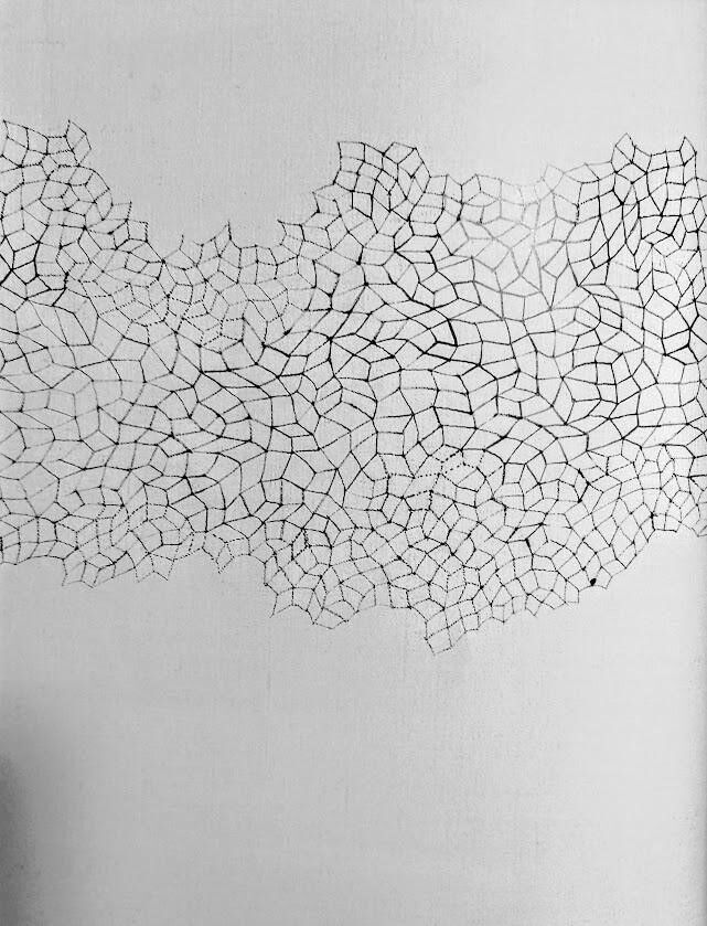 1975年ころからは細幅のロールキャンバスに、アクリル絵の具と面相筆で、日々写経の境地で画書いたという編み目紋画《スクロール・ペインティング》を実践している。巻物の始まりから極微の四辺形が結晶化を開始して延々と増殖していく。杣木がはじめて訪れた1981年当時の駒込アトリエの机上には紫の絵の具チューブや貂の面相筆、溶く小皿のセットが、白地、黒地、オレンジの巻物サイズのキャンバスがまだたくさん在った。愛子さんはこの緻密な編み目=結晶紋を銅版にも針で直彫りした。そして版画家藤江民さんによってエッチング転写された。