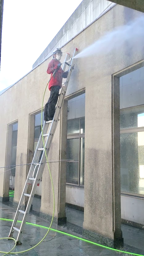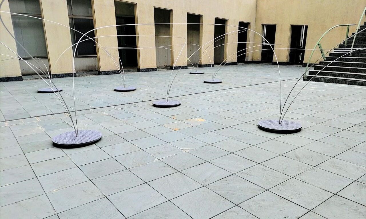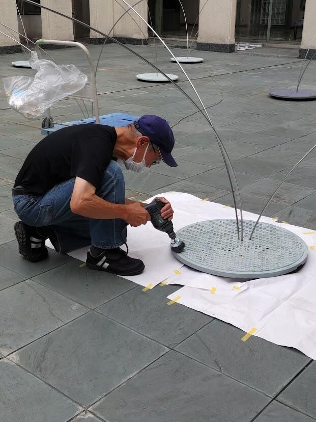 「ときの忘れもの」準備と平行して「駒場東大数理科学棟」の<うつろひ>+中庭壁メンテナンスが佳境をむかえていたのだ。1995年11月の彫刻<うつろひ>設置から30年を経て、中庭に毎日吹き溜る井ノ頭線飛来の鉄粉サビを浴びてひどく煤けてしまった。彫刻<うつろひ>のステンレスワイヤー研磨と鋳鉄基板塗り直し依頼である。しかも難関は中庭を囲うエントランスガラス面とモルタル内壁3面にサビが沈着していた。