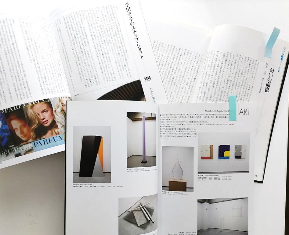 真夏の暑い盛りだったが、高木修夫人で季刊『香りの専門誌 パルファム』主宰の平田幸子さんもいらした。『パルファム』は魅惑的な新作をふくむ多くの香水を紹介していて、とくに透き通った香水の色とガラスのボトルラインの画像にはいつも魅せられている。単なる情報紙ではなく毎号、平田幸子さんの取材と多彩なエッセイ(アラン・ドロンとの対話もあった!) 新刊、映画、現代アート欄を織り交ぜて作家の作品紹介がある。また吉本隆明、谷川渥など各界人がリレー式に執筆する「匂いの随筆」があり、「アート」欄にはABSTや杣木も、くり返し採りあげていただいた。