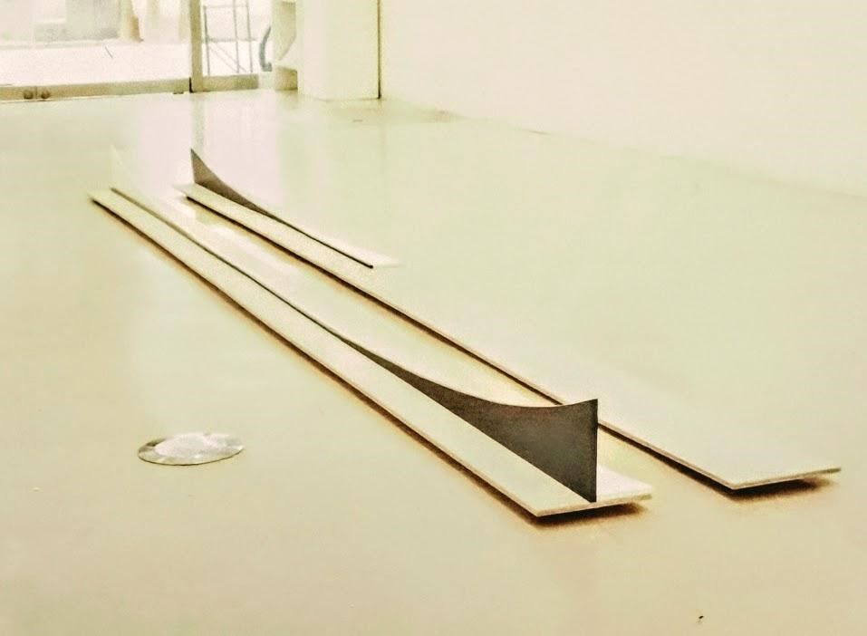 写真を見ると、白と黒の反り返った壁付けパーツ2点の脇に立つ。前回2010.第7回ABST展(人形町ヴィジョンズ)では床置きだったのだが観客が誤って蹴飛ばすのに懲りて壁にとりつけることにした。