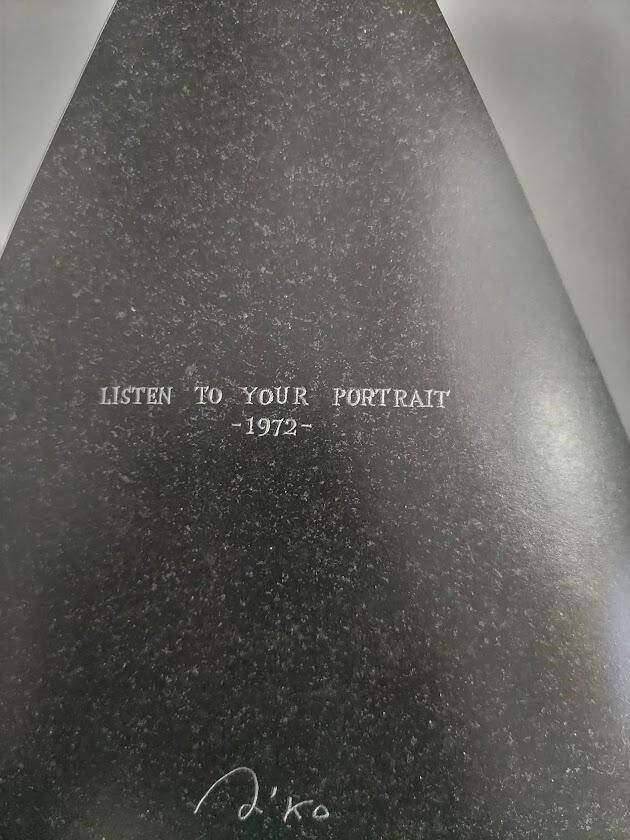 1975~<Listen to your portrait>自分自身への墓碑のつもりで制作したという、磨いた黒御影石の斜傾二等辺三角形面に「ことば」を刻んだ。