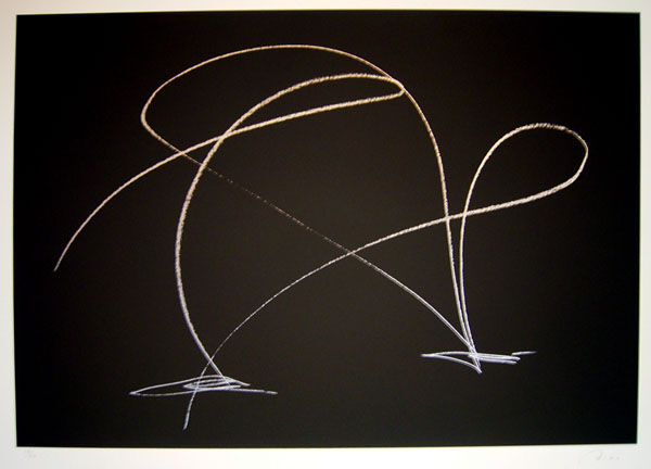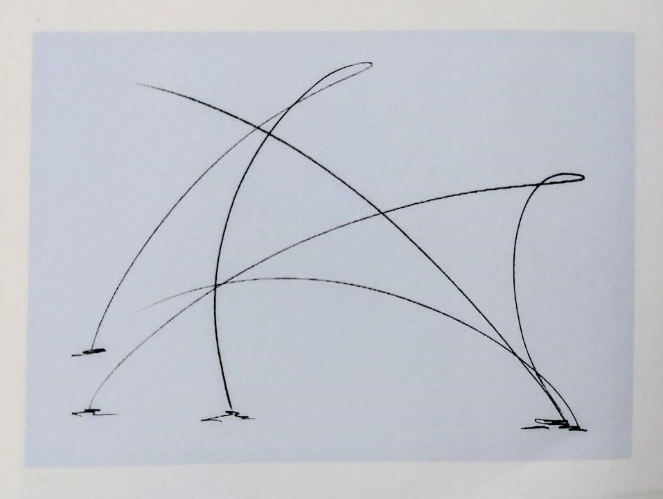 〈現代版画センター〉といえば愛子さんがはじめて<うつろひ>ドローイングをシルク印刷してタトウに納めた。ふつう愛子さんが画く<うつろひ>ドローイングの多くは、右上がりの撓んだ輪が一気に往還する禅的「抽象」であったが、このシリーズのシルク作品においては、大気イリュージョンの青みを地色にして黒線によって、大地から立ちあがるワイヤーラインとして、跳ね延び膨らみ捻れるテンションを「実景」として画いた数少ないタイプである。