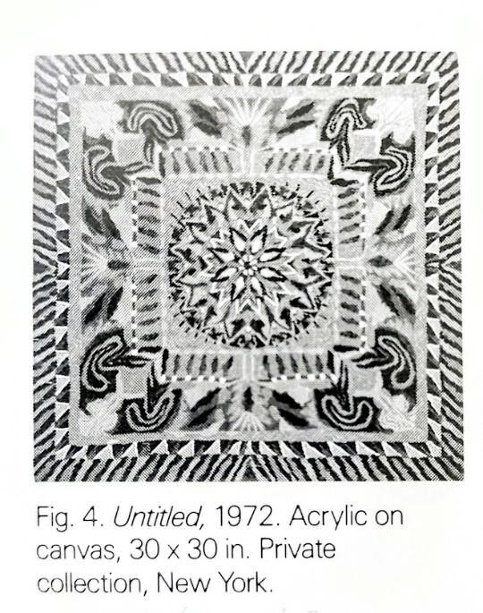 1960年代を終え70年代になると、マクラッケンは鏡面研磨作品と併行しつつ鮮やかな彩色の「曼荼羅絵」を多く描いていることは、このころのマクラッケンのアートにおける精神的次元(Melinda Wortz)を示唆していて興味尽きない。