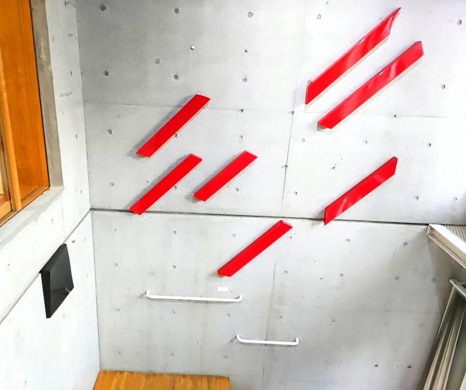 方向性。赤という強い色彩。形状の把握との関係、壁面との関係。空間を活性化する。