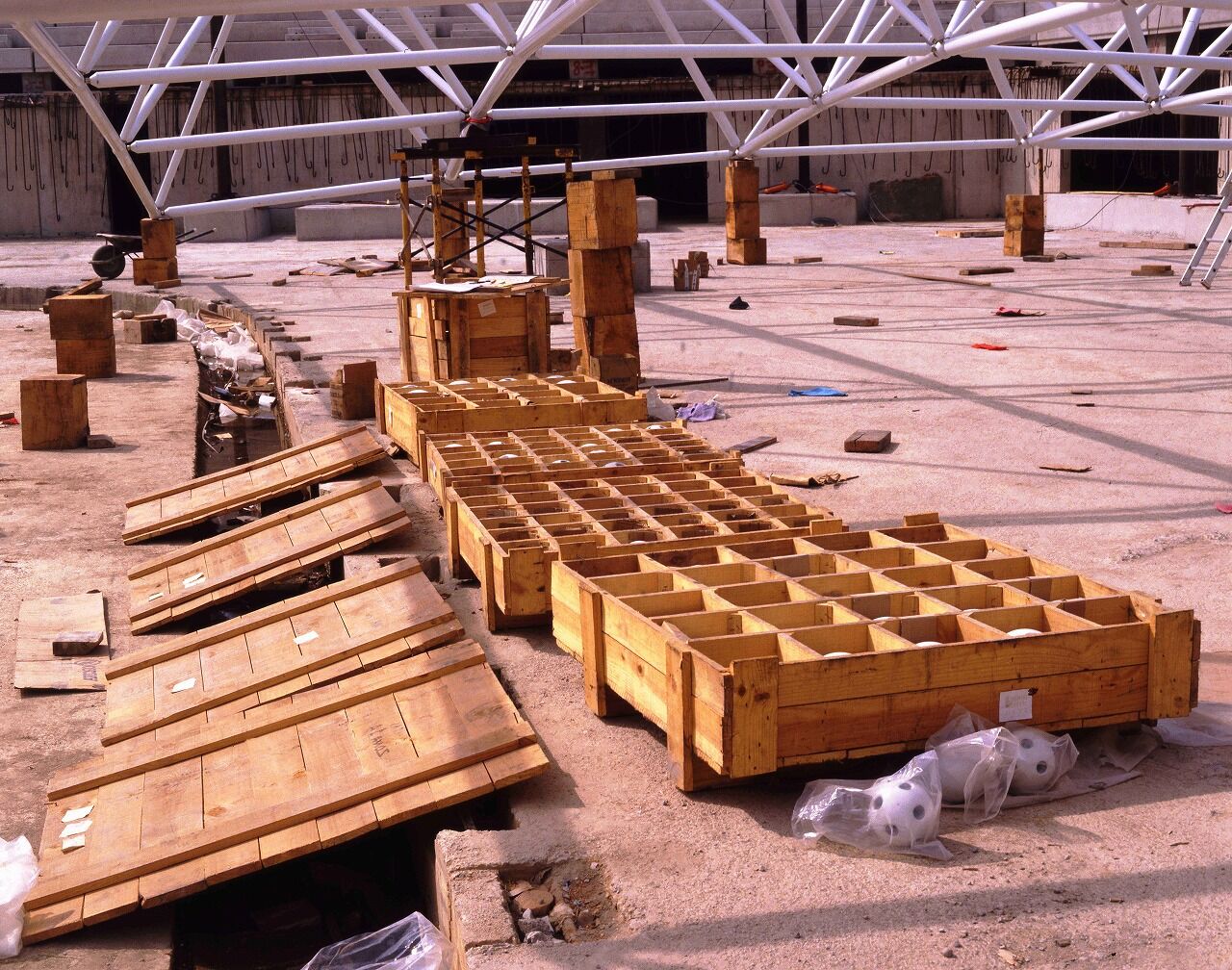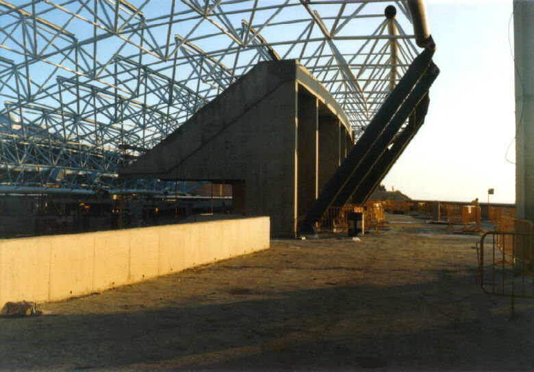 そして大屋根のスペース・フレームの製造・製作が当然最大の焦点になってきた。大屋根はローマン・アーチのような半円形の効率の良いアーチではなく、ヴォールトが潰れた形にすることで、良質な内部空間を作る事が考えられていた。スペインにも複数のスペース・メーカーが存在していたので、これも工場設備を見学させてもらった。そして製作、施工会社によって実作品も見せてもらった。そのなかには当時話題になっていた最大規模だった、バスク地方のビットリアにある闘牛場をインドアにするという作品も見学した。しかしスペース・フレームが使われていたのはガソリン・スタンドのように規模はあったものの、いずれもフラットな屋根、つまり部材が全て同じ形状だった。しかし、設計が進んでいく中でパラウの大屋根は数か所に100t以上かかるポイントがあるためにジョイントのタイプは限定され、自ずとメーカーもスペインでは一社に絞られていった。