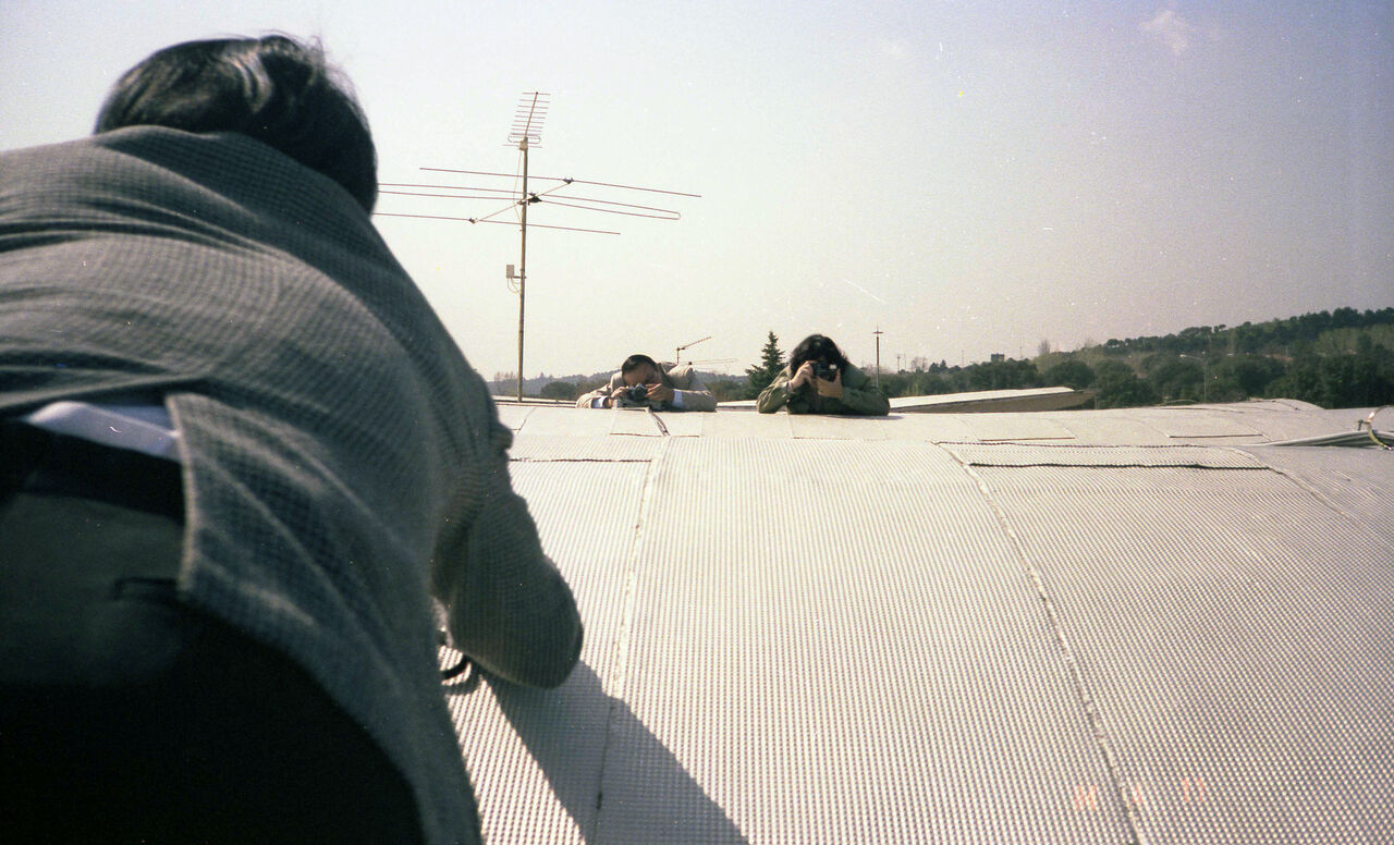 5. マドリッドでトロハのサルスエラ競馬場の屋根に乗る(俯いて写真を撮る川口さんは左側)