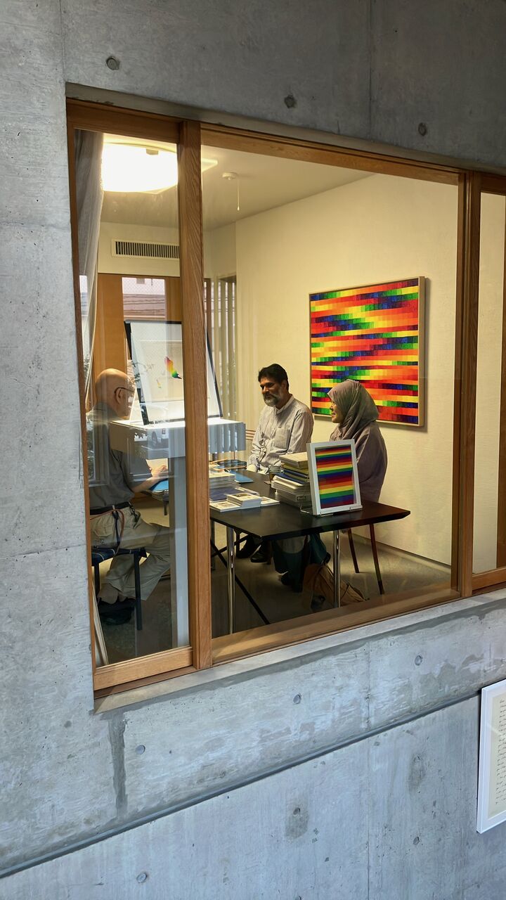 2階の図書室にて、右から飯島花子さん(靉嘔先生のお嬢様)、飯島クレイシ・ハールーンさん(花子さんの旦那様)、画廊亭主の綿貫不二夫。