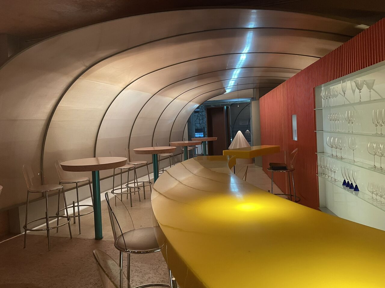 〈コンブレ〉には、倉俣特有の、透明感と浮遊感と鮮やかな彩りがある。子細に観察すると、大きな面を構成する内装材や家具が、一体の、継ぎ目(目地)がない仕上げによって作られている。そのことが、空間に連続感と、滑らかな空気をもたらしている。そのような独自の作り方には、当然優れた製作の技量と、それをデザイナーが周知している必要がある。