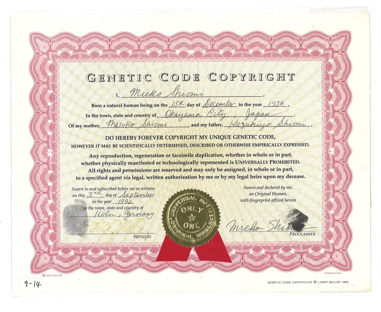 《GENETIC CODE COPYRIGHT》 1992 紙に印刷 21.5×28.0cm ラリー・ミラーと塩見允枝子のサインと拇印あり