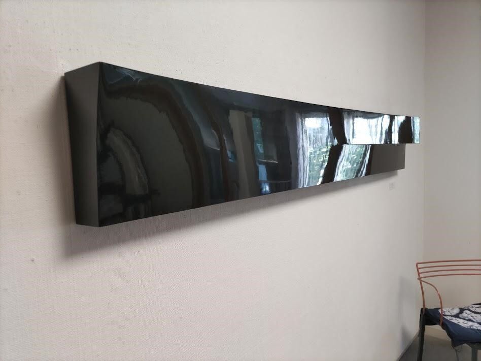 絵画的なフォーマット。絵画のように見える。水平、垂直のパネル状の形を想像して見ている。手前の面は、どこに定位しているのか(視覚において)。厚み、曲面、カーヴ、エッヂ。黒と形。