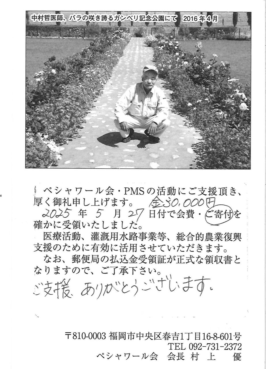 先月5月は2点が購入され、作品代金30,000円を全額ペシャワール会に送金いたしました。送金累計は、2025年6月11日現在で5,264,986円となりました。皆さんのご支援を心より感謝いたします。