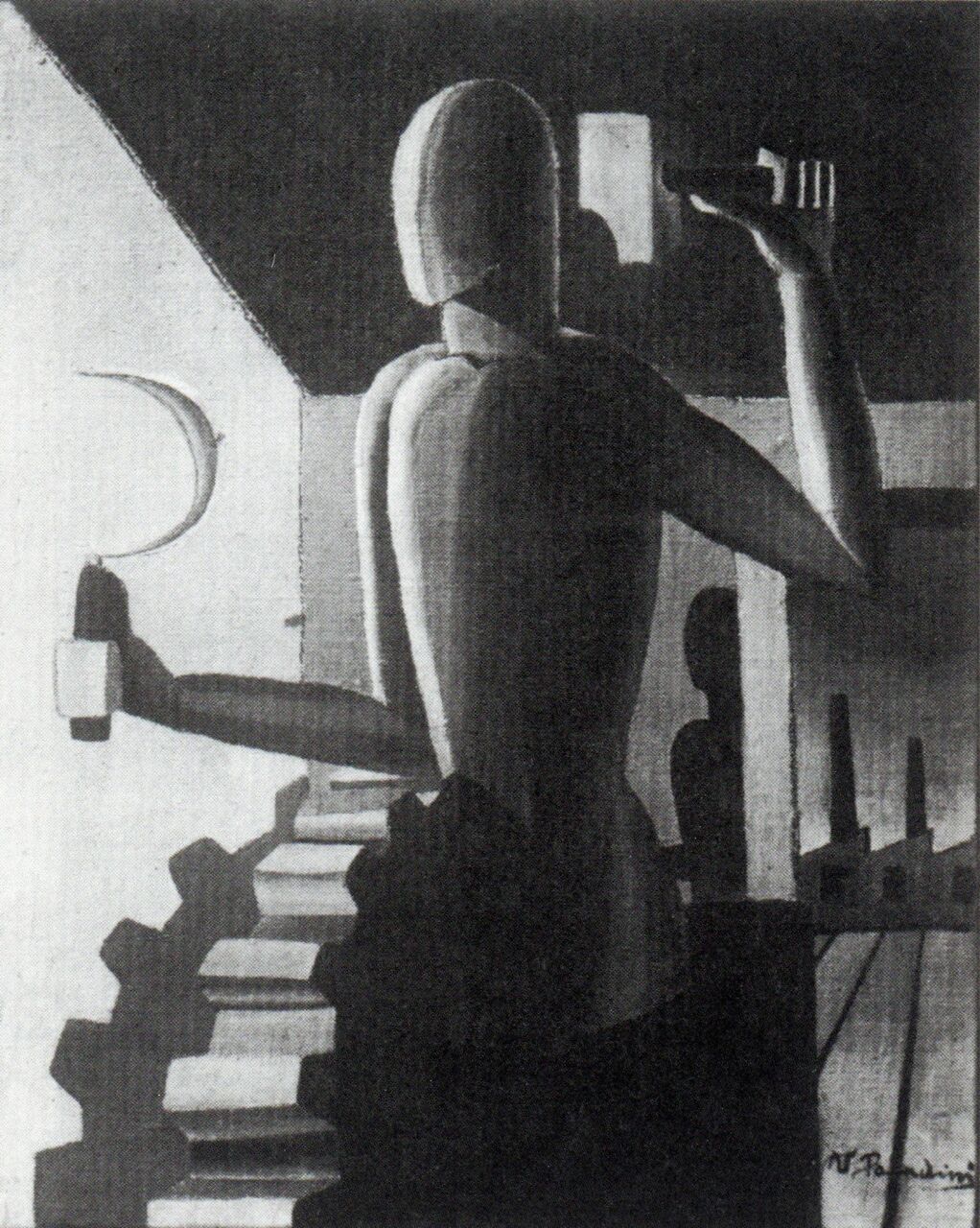 未来派の歴史の中で、そうした人々は少数ながらも存在している。芸術運動の誕生前後においては、マリネッティが主催する『ポエジーア』誌の寄稿者としての評価を受けつつ、軍国主義への反対者であったことから、新しい芸術運動とは一線を画した詩人ジャン・ピエトロ・ルチーニ(1867-1914)が知られている。また、以前紹介したフィッリアと同世代のヴィニーチョ・パラディーニ(1902-1971)は、1920年代に「機械の芸術」を推進した芸術家の一人として日本でも紹介されているが【図1】、それと同時期の彼は「共産主義芸術」(1922年)のようなアピールを発表し、自身の「機械的」スタイルによる労働者像【図2】を描くなど、1917年のロシア革命に対する芸術の側からの「同伴者」的姿勢を示したことでも注目されている。