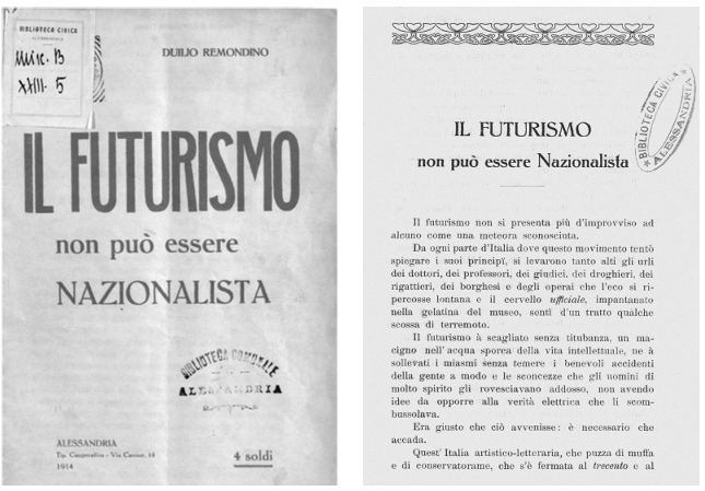 『ラチェルバ』を担ったアルデンゴ・ソッフィチは、後に「未来派」と「マリネッティ主義」を異なるものであると分離し、その上でマリネッティを批判していくが、レモンディーノはソッフィチとは異なる「マリネッティ主義」批判の基準を、「ナショナリズム」や「戦争」に据えた。そのことは、彼が1914年5月に自費出版した『未来派はナショナリストたりえるか』と題する16頁ほどのパンフレットでも明らかである【図3】。『未来派はナショナリストたりえるか』は、1913年10月末から11月にかけて行われた国政選挙に際し、マリネッティらミラノの「未来派グループ指導部」が連名で発した、「未来派の政治的プログラムProgramma politico futurista」と題するリーフレットの内容に反論するものであった。