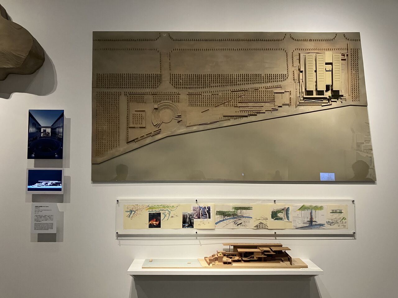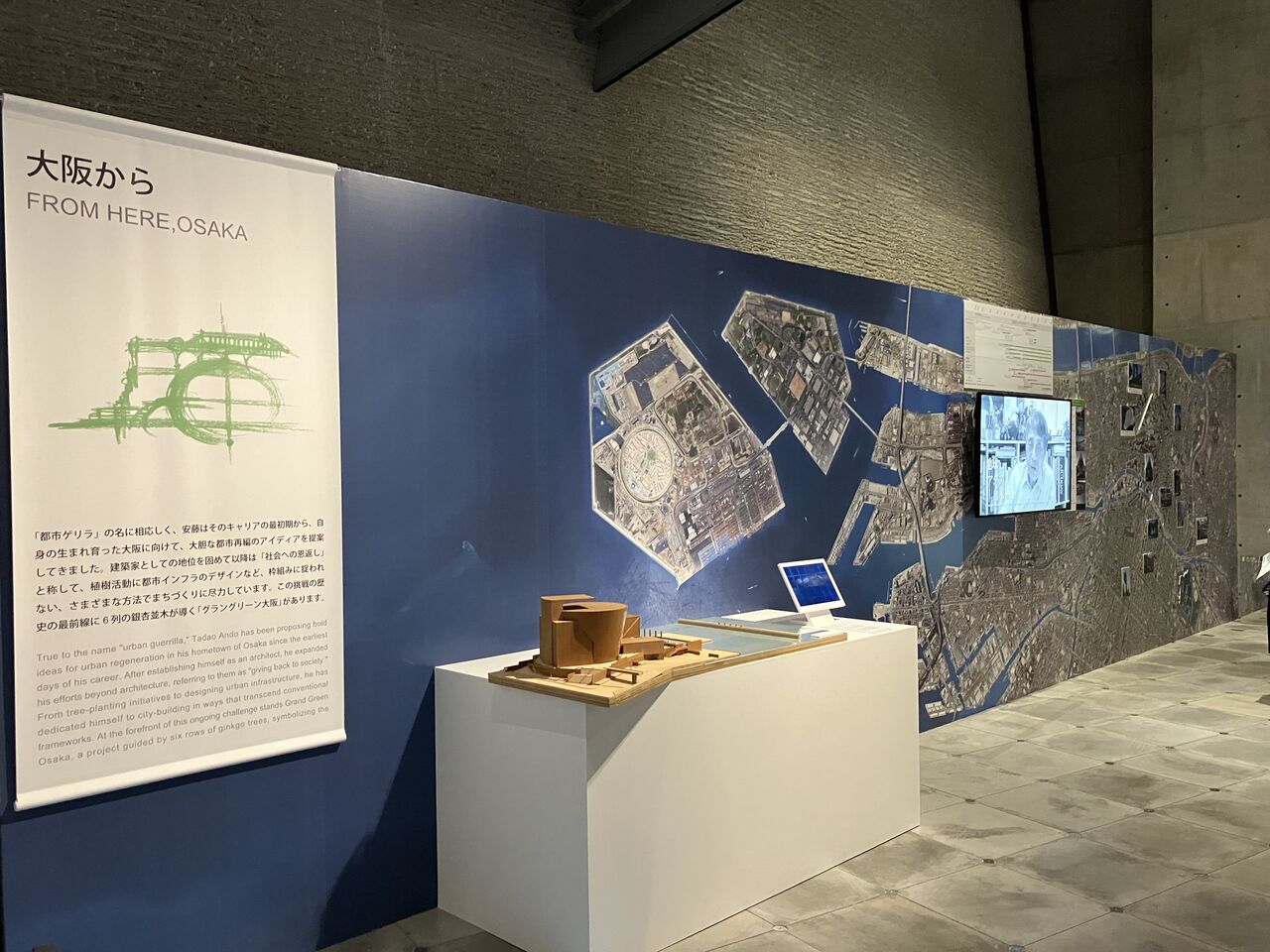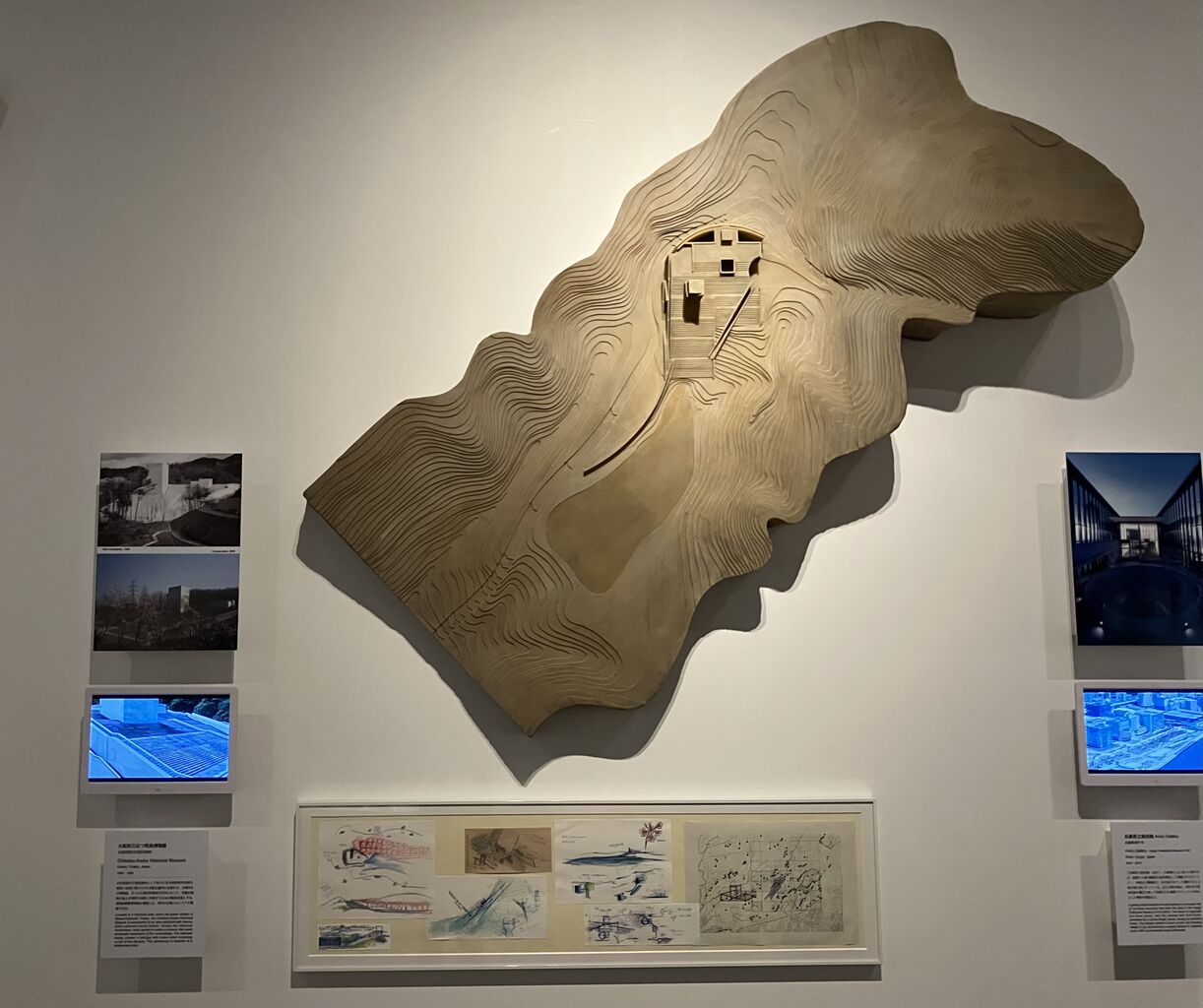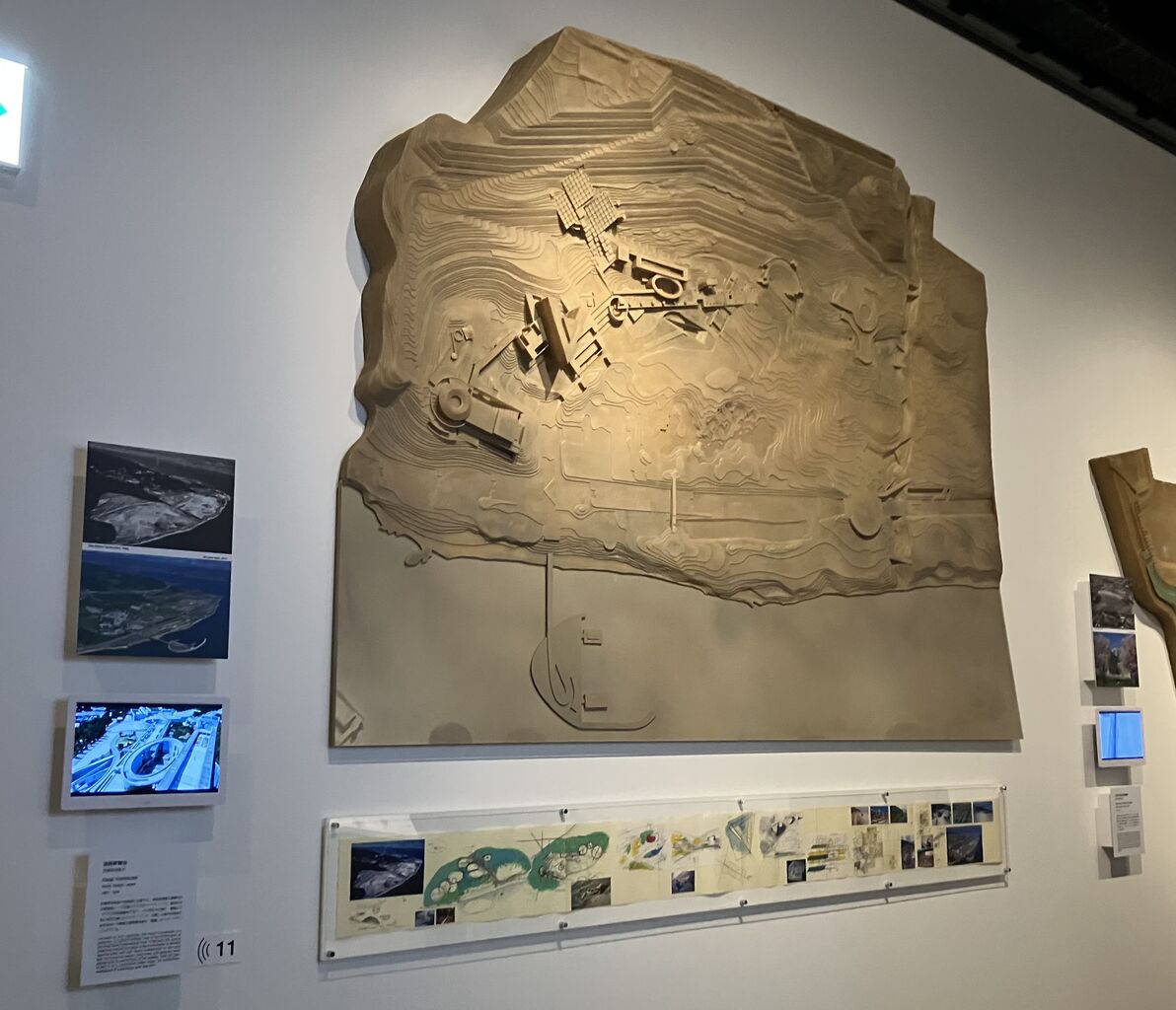 「大阪府近つ飛鳥博物館」展示風景また、自然の地形を利用した半円型の野外劇場というモチーフの参照元が古代ギリシャの劇場にあることは言うまでもない。そして、このモチーフは、敷地の持つバックグラウンドやカルチャーとまるで関係なく、「淡路夢舞台」(1993-1999)の野外劇場(3000席)、「兵庫県立美術館」(2001)に隣接する神戸市水際広場「なぎさ公園」の「マリンステージ」(1500席)としてランドスケープに刻まれていることが、本展の「風景の創造」の章に展示されている模型を見ていると読み取ることができる。