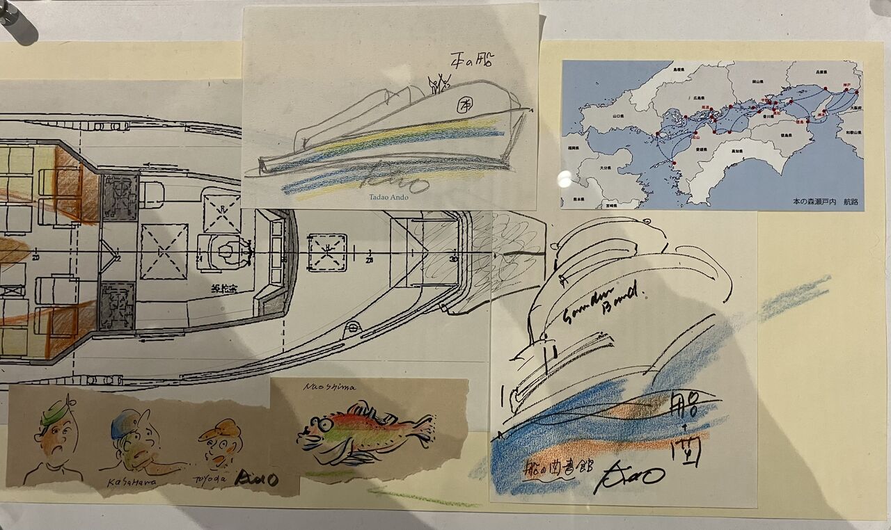 会場内「37年目の直島」の模型の側に置かれていた船「こども図書館船 ほんのもり号」(2023-)は、安藤忠雄建築研究所が小型旅客船の内装を改装し移動式図書館として香川県に寄付し、今年度から運行が始まった。香川では高松市立や丸亀市立の図書館の移動図書館車が管轄の島を巡回して町民へ図書館サービスを届けているが、ほんのもり号の場合はおそらく(展示物からの推察でしかないが)自治体の縦割りではない北前船のようなネットワークを想定している。今のところ、県下の島を中心とした保育園・幼稚園・学校連携などの行事で活躍している。