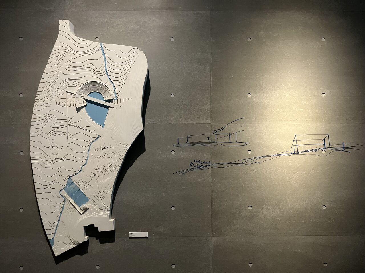 「水の教会」は、受動的に鑑賞するインスタレーションがある一方で、図面2点(断面図と平面図)、スケッチ6点、模型1点、隣接して計画された「水の劇場」を含めた模型1点が展示されている。なぜ、実現した案と計画案の2つの模型を展示したのだろうか。縮尺の違いだけだろうか。そこには、未完のプロジェクトへの強い思いがあるのではないか。