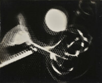 この「メロンの皮(のパターン)」を出現させているのは、模様が施された磨りガラスである。模様のある磨りガラスは、光を透過するものの、不透明に近い半透明というべき性質を備えており、光によって印画紙に定着される際は、ガラスとは全く異なる質感となる。湯浅コレクションの中では、ややわかりにくいが、以下の作品の右上をよく見ると、同じパターンが確認できる。