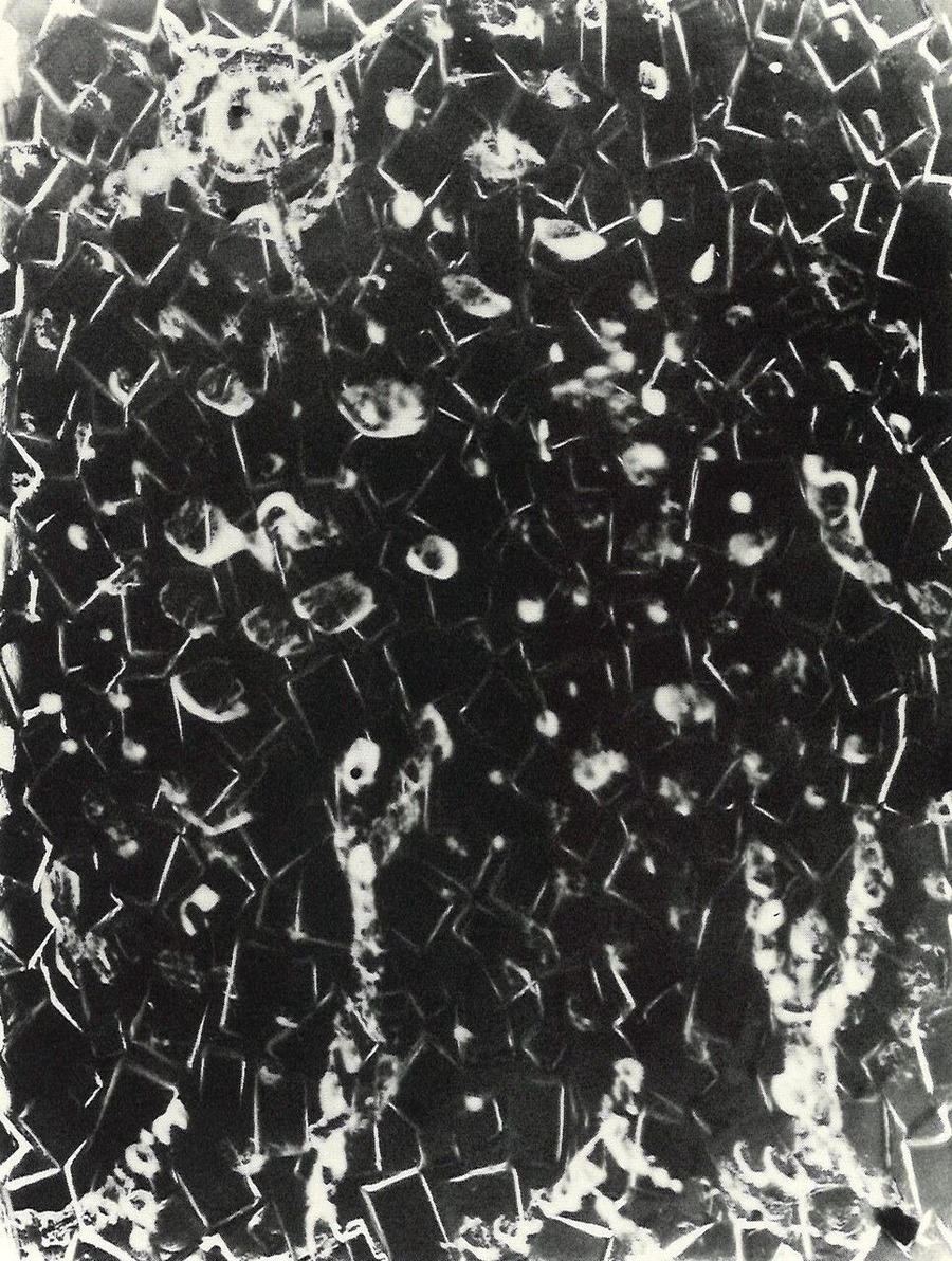 長年、このパターンを生じさせる磨りガラスがあるはずだと思っていたが、数年前、古いガラスを作品に用いたアーティストの展示を見た時に、念願叶って(?)、このパターンを持つガラスを見ることができた。そのことにより、瑛九のフォト・デッサンにおける「メロンの皮(のパターン)」が、間違いなく、磨りガラスに由来することが確信できた。また、補足しておくならば、今回取り上げる作品(fig.1)の右側にうっすらと見えているパターンも、同じく模様を施された磨りガラスに由来すると思われる。同様のパターンは、以下の作品にも表れている。