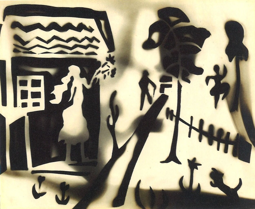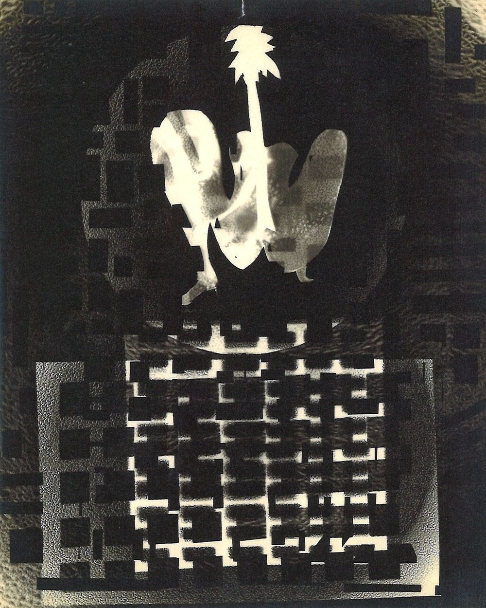 素朴なデッサンとは異なり、このような明暗、あるいはネガポジの組み合わせとして画面の構成を考えるとなると、型紙を作る際に、最終的なレイアウトをよく考えておかねばならない。レイアウトというと、配置や構図と理解するのが一般的であるが、瑛九のフォト・デッサンの場合は、そこに、明暗やネガポジという要素が絡んでくる。そのように、瑛九におけるフォト・デッサンの制作の場面を具体的に思い浮かべることによって、「制作の前に「デッサン」や「レイアウト」を充分やって、それから本焼きに入ります。」という瑛九の言葉が、リアリティーを持って響いてくる。
