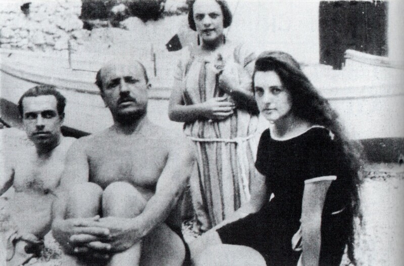 図4:カプリ島にて水着でくつろぐ未来派たち、エンリコ・プランポリーニ(一番左)、マリネッティ(左から二人目)とベネデッタ(一番右)、1922年。