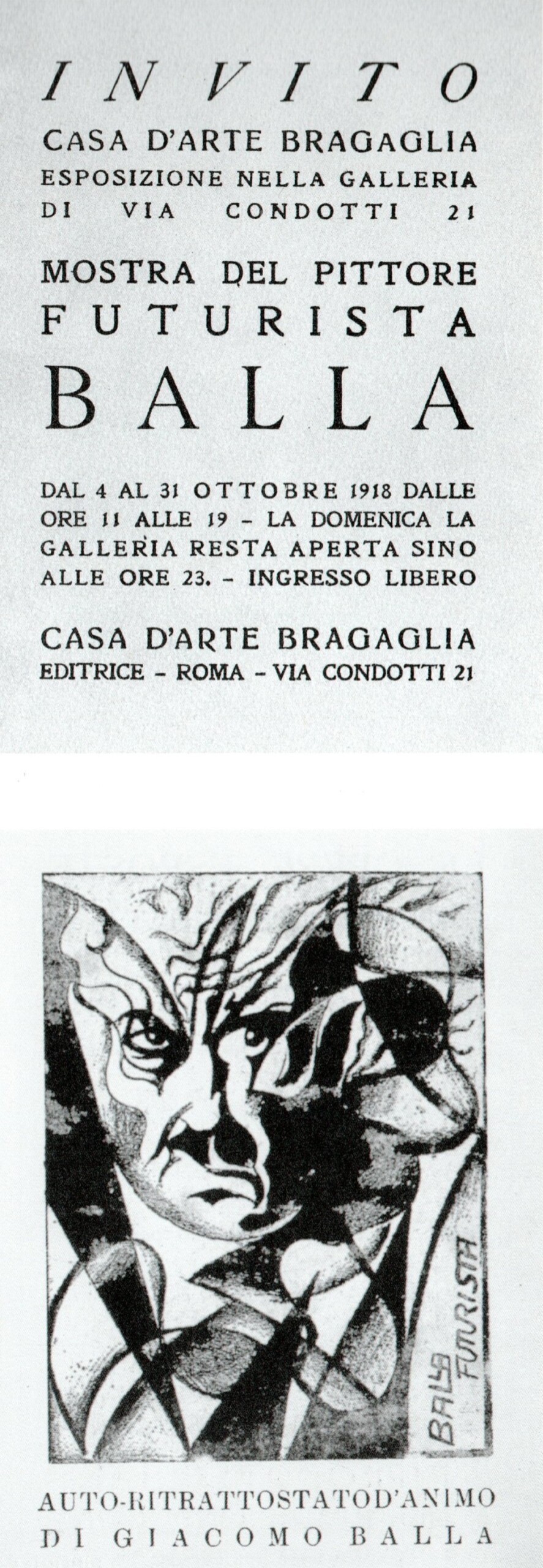 図2:ローマの「ブラガーリア芸術の家」で開催された「未来派画家バッラ展」カタログ、表紙および画家の自画像、1918年10月。