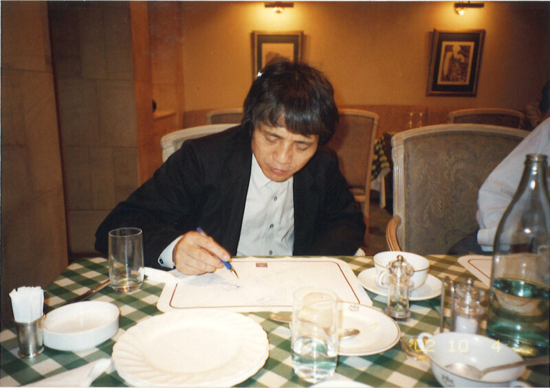 2002年10月4日 東京大学のレストランにて、テーブルにあったランチョンマットにデッサンする安藤先生。