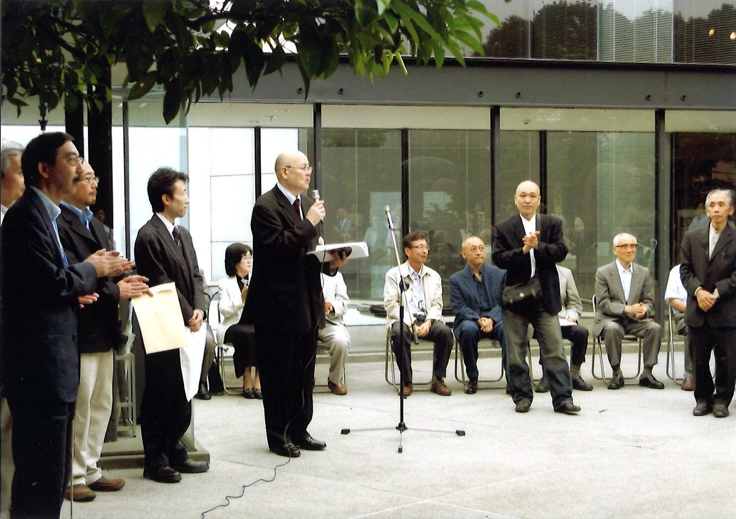 左から小野作品のコレクター小泉清、樋口昌樹(資生堂)、二人おいて挨拶する綿貫不二夫、荒井由泰(福井・アートフル勝山の会)、小野隆生、北澤敏彦(小野展のカタログデザインを担当)、
