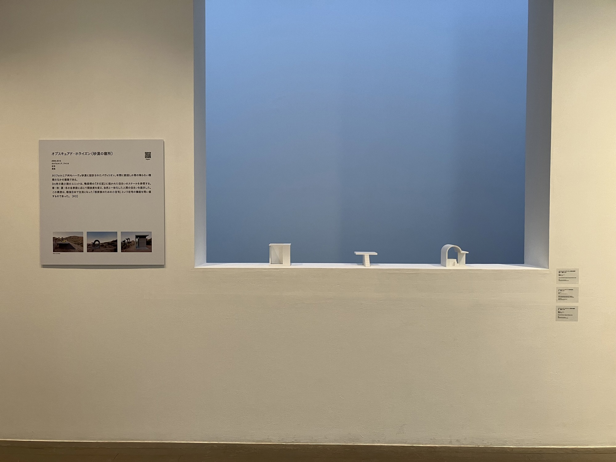 展覧会の中では、キュレーションのパートに続く終盤の第8室に展示されていた。現代美術ギャラリーの入口・出口の階段に面した壁の開口部に、スケールS=1:20にも関わらず手の上で賞でることのできそうな小さな模型が3点並び、現地の写真がキャプションに添えられている。写真が地形、場所の空気感、素材といった情報を補うのとは対照的に、3Dプリントでできた樹脂のコンセプト模型は、かたち以外の情報を含まない。「オブスキュアド・ホライズン(砂漠の寝所)冬」は、キューブ型で側面の一部と屋根にガラスが嵌められている。同「夏」は7段の階段が1面の高床を支えている。同「春秋」はアーチ状の屋根、2方向の壁、小上がりの床を持つ。それら3つの抽象的な造形が、都市のインフラやサービスから孤立した広い砂漠という現実の場所に置かれると、形は建築となって、天候や生き物から人を守ったり、人が自然の荒々しさや静寂と一体となる助けになったりする。