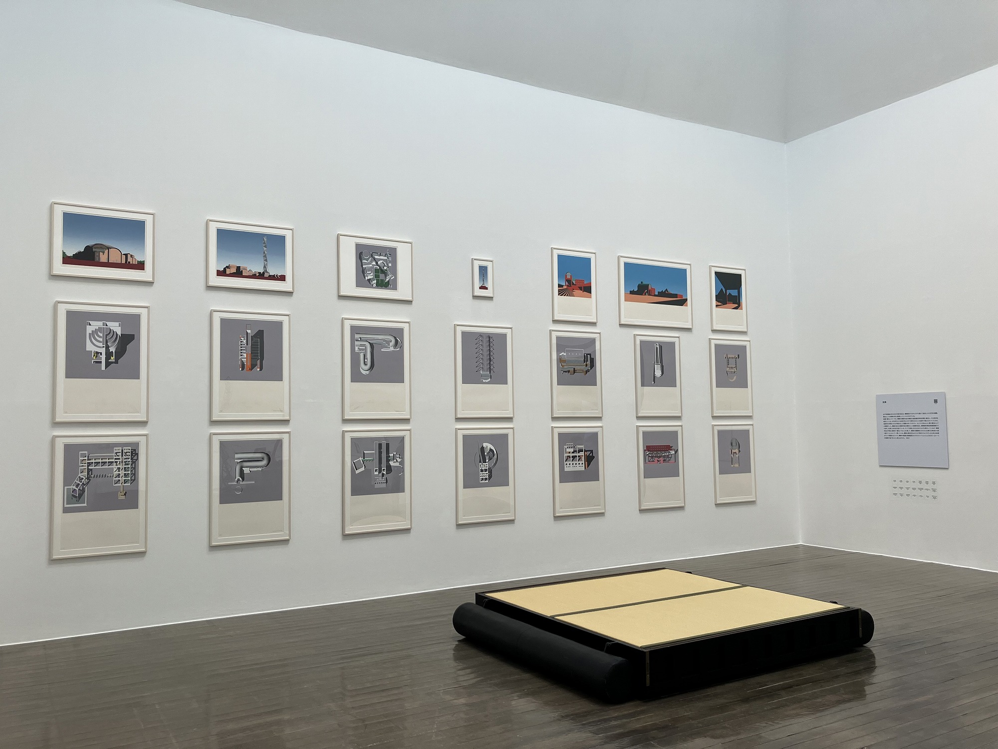水戸芸術館は、過去に水戸芸術館開館30周年記念事業「磯崎新 ―水戸芸術館 縁起―」(2019年)、水戸市民会館開館記念事業「磯崎新 ―水戸芸術館を創る―」(2023年)を開催し、水戸芸術館を中心とした磯崎新の美術館建築を紹介してきた。今回の「磯崎新:群島としての建築」展は、主任学芸員の井関悠さんが企画され、磯崎氏の1960年代から約60年のキャリアを辿る大規模な回顧展となっている。水戸芸術館の現代美術ギャラリーは9室あるが、概ね7つのまとまりで構成されていた。第1室は60年代の計画や活動、第2室は80・90年代のコミッショナーの仕事、第3室はスケッチブック、水戸芸術館、版画《還元》シリーズ、第4・5・6室は建築作品、第7室は展覧会キュレーション、第8室は造形と記録映像、離れた第9室は水彩画と映像作品《聲》が見られた。ゲストキュレーターをケン・タダシ・オオシマさん、五十嵐太郎さん、松井茂さんが務められ、会場設計は日埜直彦さんいうことであったが、解説文は日埜さんを含む4人で分担されていた。