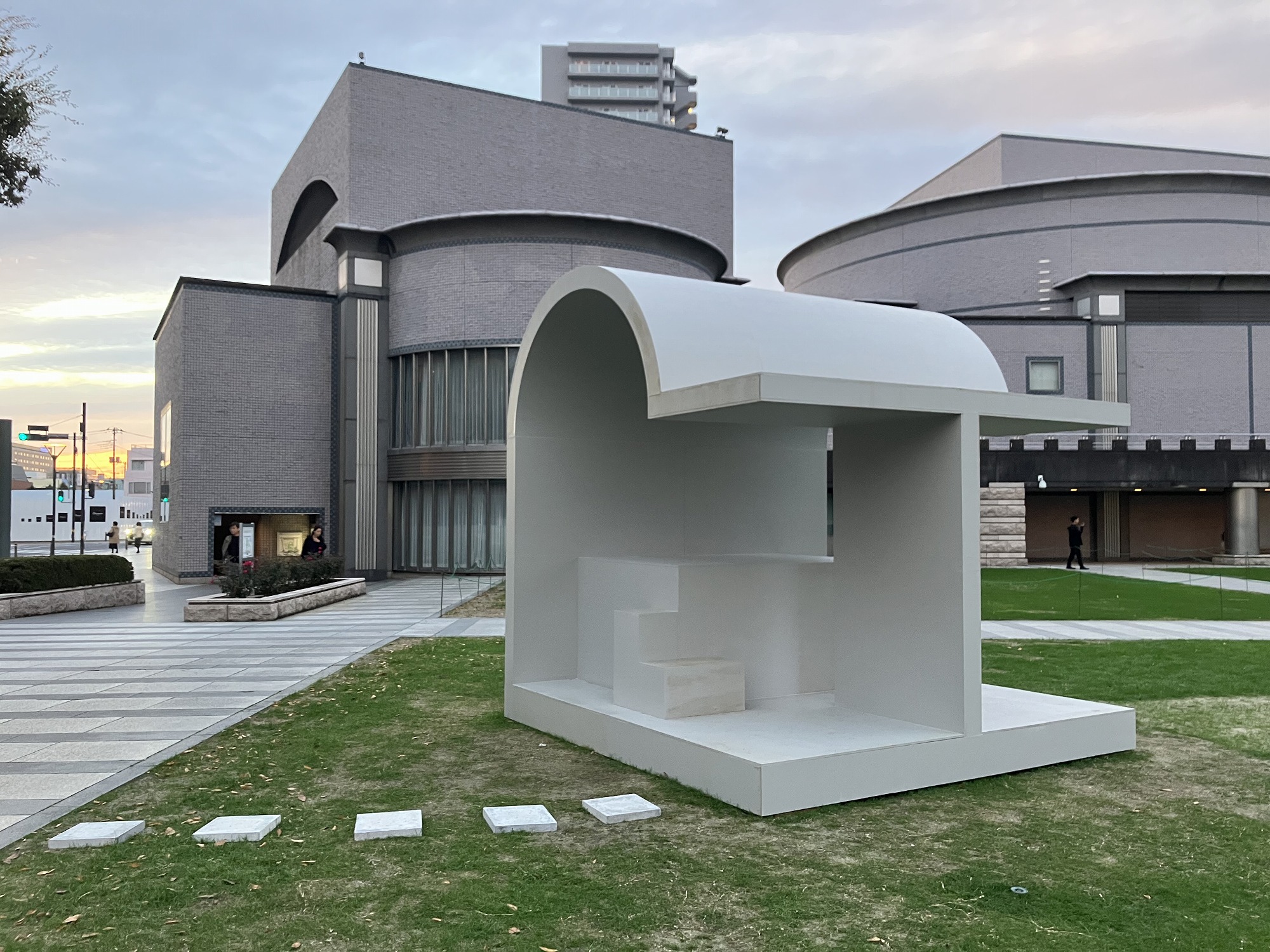 水戸芸術館は、現代美術ギャラリー、コンサートホールATM、ACM劇場、会議場があり、それらをエントランスホール、広場、回廊が繋いでいる。その広場に、「オブスキュアド・ホライズン(砂漠の寝所) 春秋」の再現(原寸)のインスタレーションがあった。私事であるが、今年、筆者は職場で「国際花と緑の博覧会」(EXPO’90)の「13のフォリー」について調査、展示する機会があり、フォリーの魅力を再認識した一年だった。「13のフォリー」は、EXPO’90で磯崎新氏がコミッショナーを務め、鈴木明さんと太田佳代子さんが主宰されていた建築都市ワークショップが事務局を担い、国内外12組の建築家と協業者たちによって創られた小規模の仮設建築であった。13のフォリーに参加した一部の建築家は、くまもとアートポリスや、NTTインターコミュニケーションセンター(ICC)「海市-もう一つのユートピア」展(1997年)にも指名されている。そうしたことから、「オブスキュアド・ホライズン(砂漠の寝所)」は、磯崎氏ご自身が到達されたフォリーだと捉えるに至り、その原寸を体感することで茶室との関連が無視できないことを感じた。