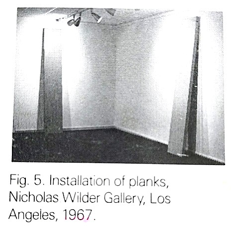 5. これらのわれわれをさらに遠くへ誘う知覚上の沈思は、マクラッケン作品固有の精神的衝動の本質であると見做す。彼の彫刻の幻覚的なエレメントは、その初期アーチストとしての展開と関係がある。かれはキャンバスにペインティングを始め、そしてしだいに他のマテリアル、たとえはキャンバスにラッカーのような、そして壁に掛けるレリーフを制作し、そしてついに文字通り壁から外れて空間に自由に立つことになった。( fig.1 ~ fig.4 参照 )しかし、興味深いことには壁から環境における三次元存在へ解き放たれた作品は、この冗長な全過程を終えたあと、ただちに、彼がみなされる彼をアーチストとして連想させるもっともユニークなフォーマット : 壁に立て掛けるプランク「厚板」、へと進めたのである。( fig.5 )堅固に直立するにはあまりに薄いので、その愛を込めた精巧で、高度に光を反射するオブジェクトは、支えのための壁を必要としたのだ。ある意味でこの工夫は、60年代後期におけるジャッドやフランク・ステラのような他のアーチストたちの努力、壁に統合しあるいは孤立した存在として扱う代わりに、芸術作品とともにある、芸術作品存在のなかの文脈的状況と関連づけられる。