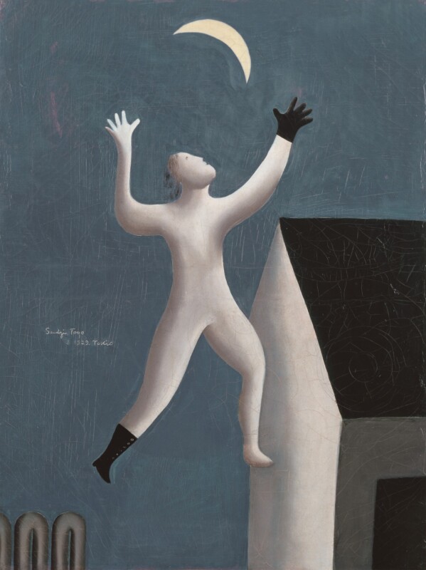 本展の最後を飾るのは、東郷青児《超現実派の散歩》(SOMPO美術館所蔵)である。日本におけるシュルレアリスムの最初期の作例としてよく知られているだけではなく、SOMPO美術館にとっても象徴的な一点といえる。2014年より、この人物像を当館のシンボルマークとして採用している。