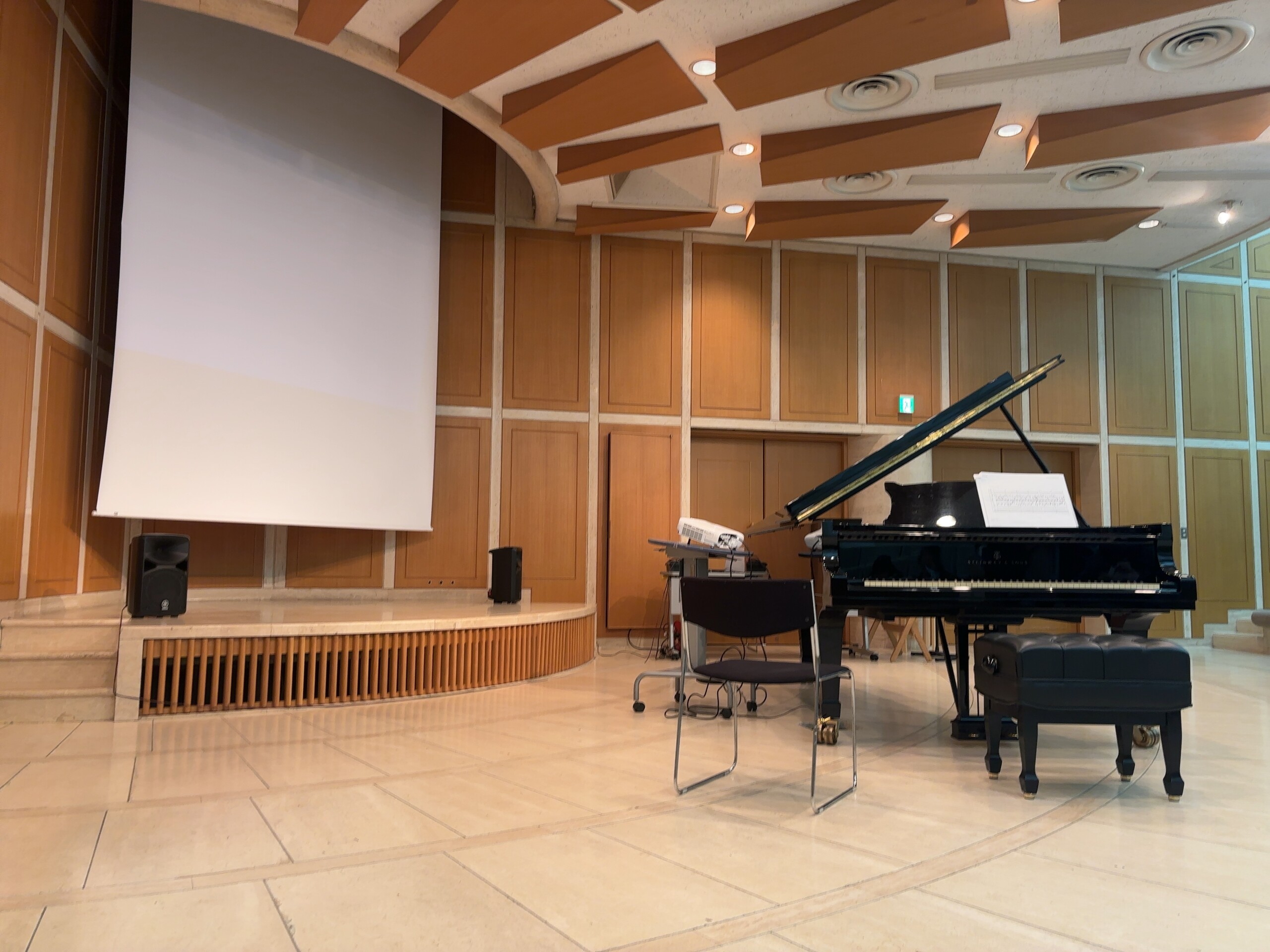 講堂に入ると中央にグランドピアノ。上手(画面右)には小道具のようなものが並んでいます。