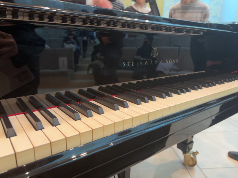 が、ここでアクシデント。会場のエアコンの風によって譜面台に置かれた紙の楽譜が床に落ちてしまいました。二人は真顔でゆっくりと顔を見合わせますが両手の演奏は止めません。冷静な二人の姿に観客から笑いが起きます。柴山さんが瞬時に床から楽譜を拾い上げて譜面台に戻して完奏。演奏後に川崎さんが「風の悪戯ですね」と一言。こういうハプニングもライブならではですね。
