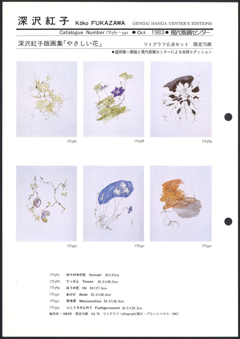 深沢紅子 版画集より「やさしい花」より:「ゆりの木の花」「てっせん」「ほうの花」他3点 現代版画センターエディション