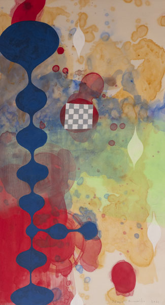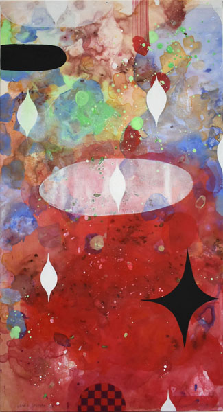 根岸文子は美大卒業後スペインに渡り、ユーモアに溢れる明るい作風の作品で、今回は絹に描いています。