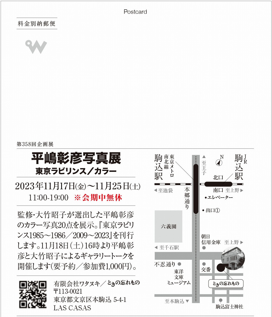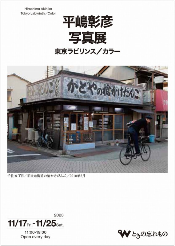 2020年に第一回平嶋彰彦展を開催し、平嶋彰彦ポートフォリオ『東京ラビリンス』(ゼラチンシルバープリント写真15点)を刊行しました。 第二回展となる本展では、平嶋彰彦が街歩きをして撮影したカラー写真の中から監修の大竹昭子が20点を選出し、ニュープリントした作品をご覧いただきます。 展覧会に合わせて作品集『東京ラビリンス1985~1986/2009~2023』を刊行します。第一回と第二回の全出品作品と、平嶋彰彦と大竹昭子による対談を掲載しています。 11月18日(土)16時より平嶋彰彦と大竹昭子によるギャラリートークを開催します(要予約/参加費1,000円)。メールにてご予約ください( info@tokinowasuremono.com )。
