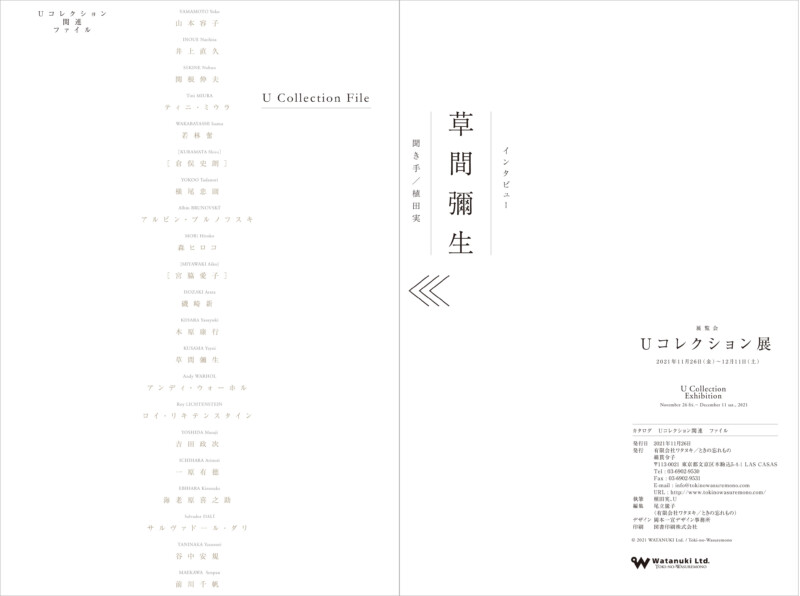52頁に及ぶカタログでは、U氏と草間彌生さんとの対談(1983年)や今までの評論の再録と併せて、新たにそれぞれの作家について綴った覚え書きを収録しています。