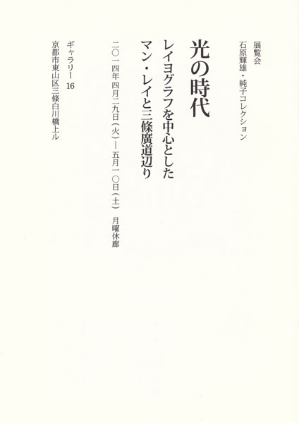 執筆:石原輝雄 出品目録51点 展覧会『光の時代 レイヨグラフを中心とした、マン・レイと三條廣道辺り』のカタログが完成しました。展覧会の意図と展示への思いを「レイヨグラフと三條廣道辺り」と題して綴り、出品目録51点(図10)を表記すると共に、マン・レイ、中西武夫、俵青茅、天野隆一の四氏について簡単な紹介をしました。表紙A-プラン71.5kg 本文47.5kg、銀紙書房による小部数手作りカタログです。 (石原輝雄さんのブログ「マン・レイと余白で」4月13日付記事より転載)