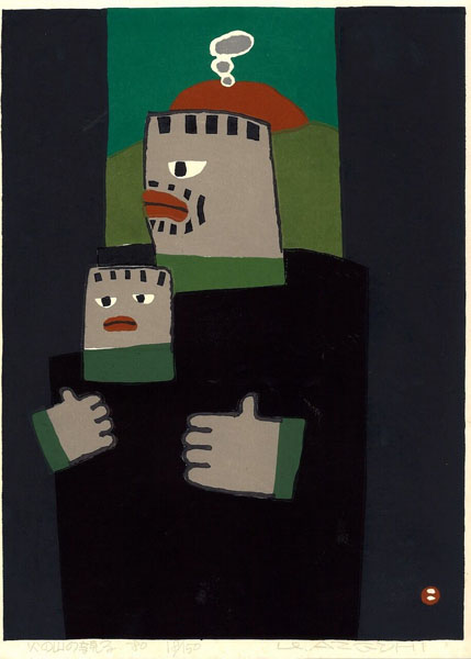 畦地梅太郎版画集『火の山の人たち』より《火の山の親子》 畦地梅太郎 この作品について問い合わせる 1980年 木版多色 39.4×28.8cm Ed. 150 サインあり *レゾネ『畦地梅太郎全版画集』(町田市立国際版画美術館、1991)No.422 この作品について問い合わせる