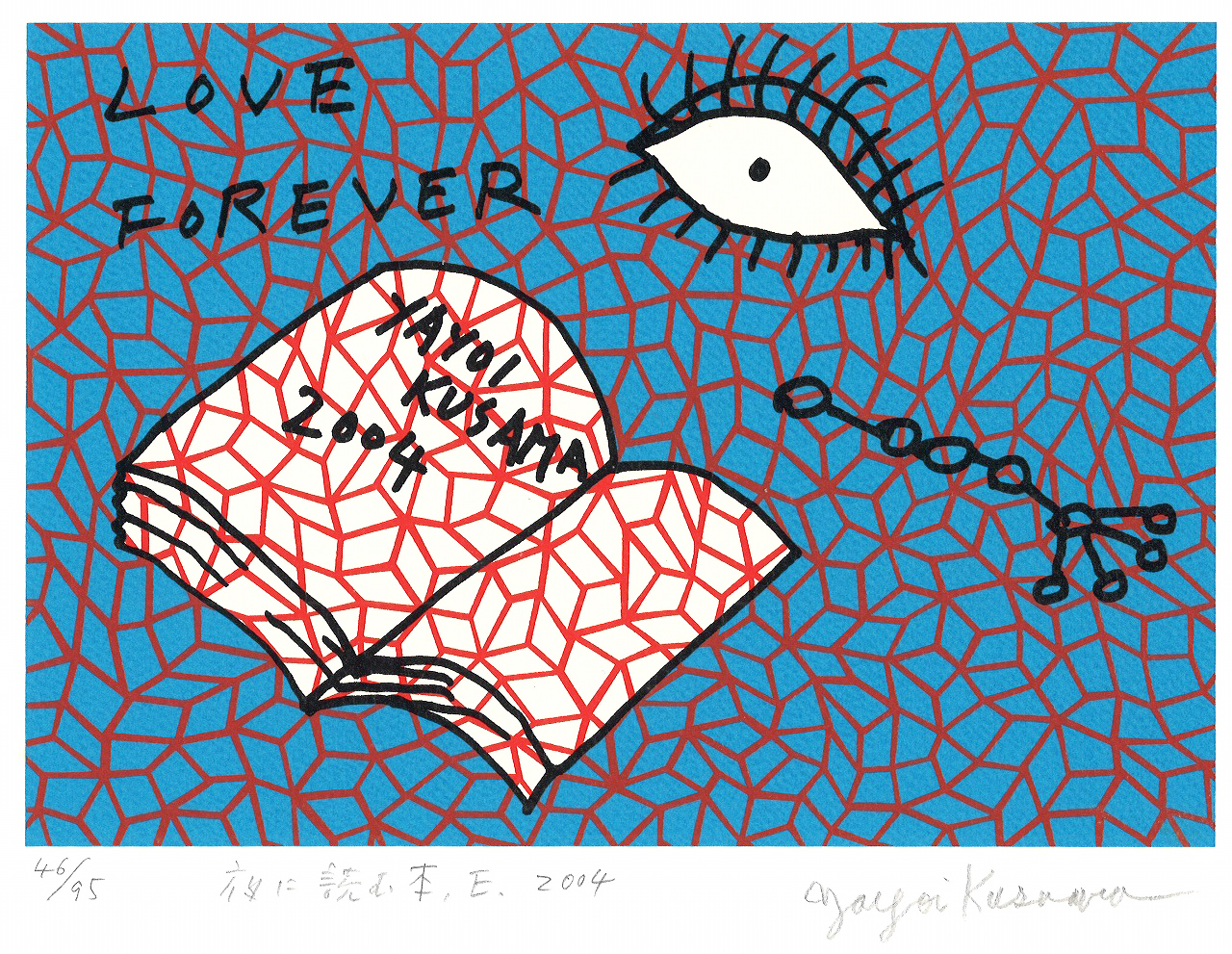 《夜に読む本 E》 草間彌生 この作品について問い合わせる 2004年 シルクスクリーン(刷り:石田了一工房) イメージサイズ:16.0×23.0cm シートサイズ:24.0×31.0cm Ed.95 サインあり レゾネNo.342(阿部出版 2005年新版) この作品について問い合わせる