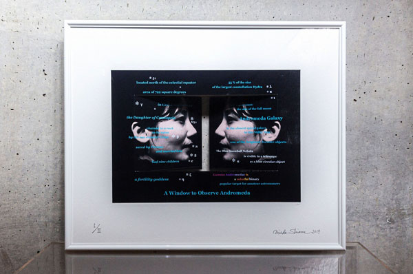 60年代の作品<二重窓>のリアリゼーションとして、昔、モナ・リザの顔を窓状に切り開いた作品を作ったことがありますが、この連作では、様々な星座を観測するための窓を作成しました。 観測者の顔には、その星座に関する情報が散りばめられています。 (塩見允枝子記)