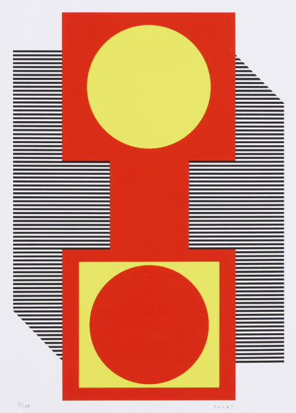 1967年の自動車事故で奇跡的に一命を取り留めますが、それを転機にシステマテックな抽象造形を一層深化させます。1976年の現代版画センター企画による菅井汲全国展を契機に名プリンター石田了一さんとのコンビで、シルクスクリーンの制作を本格化させました。明快なフォルムと鮮烈な色彩、菅井シルクの絶頂期の作品です。