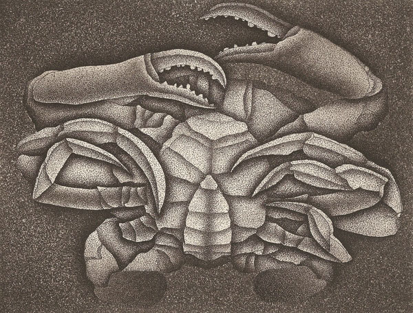 ◆被爆体験をもとに細密極まる鉛筆画で石を描き続けていた《とのしき》という珍しい作家の名前を覚えている人はいるだろうか。久保貞次郎の勧めもあって鉛筆をニードルに持ち替えて、銅版作品でもカニや貝やトンボなどの小さな生き物を細密な作品に描いた。いずれ再評価されるに違いない。